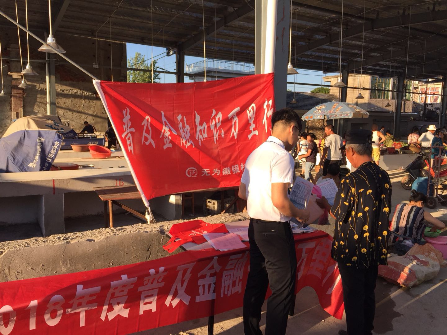 宣传现场,支行通过悬挂横幅、旗帜展示活动宣传标语,摆放金融知识宣传品,接受公众咨询,主动宣传金融支付安全知识。同时,支行员工分成两组,在菜市场周边街道商铺以及人流密集区域发放宣传单页,介绍村镇银行产品服务。