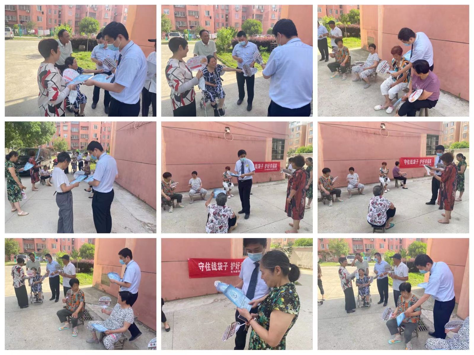 为切实维护老年人合法权益,打击整治养老诈骗,让老年人安享幸福晚年,2022年6月9日上午,蜀山支行来到蜀山镇安置小区,开展以“守住钱袋子·护好幸福家”为主题的防范非法集资宣传教育活动。